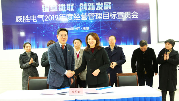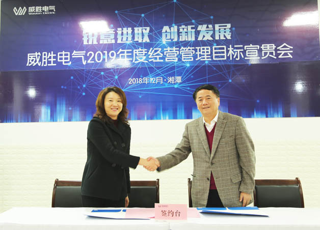 會議第二階段舉行電氣2019年經(jīng)營管理目標(biāo)簽字儀式:首先,電氣董事長曹朝輝女士鄭重向控股董事會吉主席簽署2019年目標(biāo)承諾書;隨后,威勝電氣總裁曾辛先生向電氣董事長曹總簽署2019年目標(biāo)承諾書;