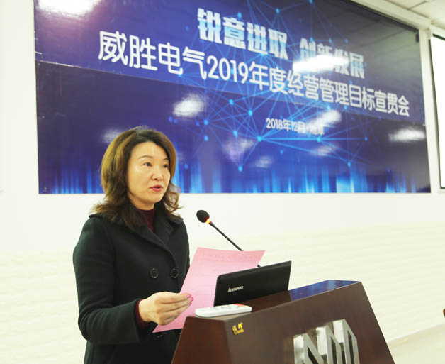 歲序更新催奮進(jìn),瑞雪霏霏兆豐年!2018年12月30日上午,以“銳意進(jìn)取,創(chuàng)新發(fā)展”為主題的威勝電氣2019年經(jīng)營管理目標(biāo)宣貫會在電氣產(chǎn)業(yè)園會議中心培訓(xùn)室順利召開。控股董事會吉為主席、控股本部、威勝電氣董事會以及經(jīng)營管理團(tuán)隊的各位領(lǐng)導(dǎo)、威勝電氣員工代表共計300余人參加了本次會議,會議由威勝電氣行政人事總監(jiān)鄧超艷女士主持。