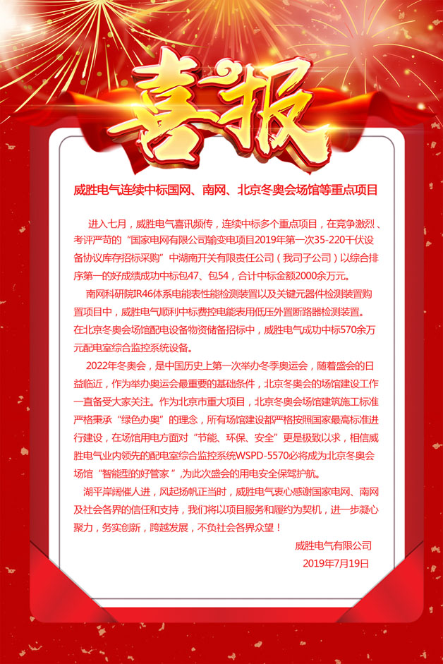 進入七月,威勝電氣喜訊頻傳,連續(xù)中標多個重點項目,在競爭激烈 、考評嚴苛的“國家電網(wǎng)有限公司輸變電項目2019年第一次35-220千伏設(shè)備協(xié)議庫存招標采購”中湖南開關(guān)有限責任公司(我司子公司)以綜合排序第一的好成績成功中標包47、包54,合計中標金額2000余萬元。