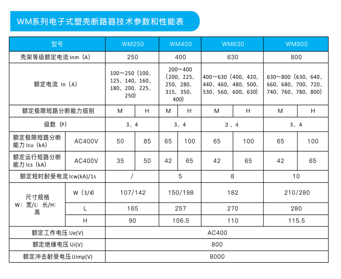 其額定工作電壓至690V、額定絕緣電壓至800V、額定沖擊耐受電壓達到BKV、額定工作電流16A-800A。WM系列斷路器適用于配電和電動機保護場合,也適用于消防場合。斷路器具有過載、短路、欠壓保護等功能,能保護線路和電源設(shè)備不受損壞。