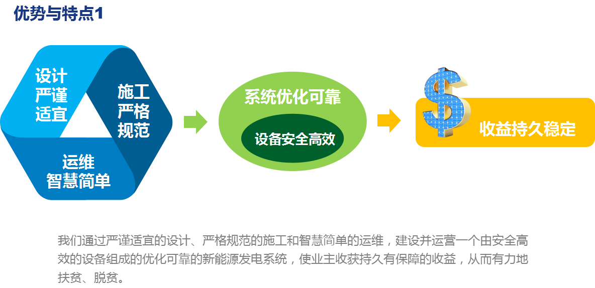 作為一家有擔當的企業,威勝積極參與光伏扶貧工程投資和建設,履行社會責任。我們通過各種方式支持光伏扶貧工程實施:與行業領先者組建光伏扶貧聯盟,配合開展規?;夥娬窘ㄔO,因地制宜確定光伏扶貧模式,建立長期可靠的項目運營管理體系。 威勝扶貧光伏電站全生命周期解決方案,致力于從開發、設計、安裝、運維各個階段為用戶提供最專業貼心的服務,通過這些服務,將扶貧光伏電站打造為始終如一的價值最大化的收益型資產,幫助實現精準扶貧、精準脫貧。