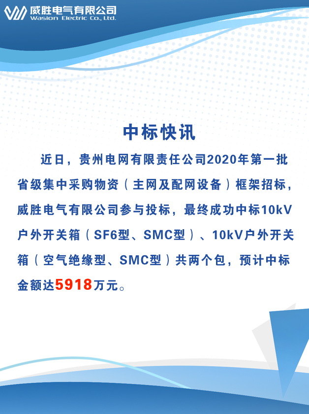 2020年4月22日,貴州電網(wǎng)有限責(zé)任公司2020年第一批省級集中采購物資(主網(wǎng)及配網(wǎng)設(shè)備)框架招標(biāo),威勝電氣有限公司參與投標(biāo),最終中標(biāo)10kV戶外開關(guān)箱(SF6型、SMC型)、10kV戶外開關(guān)箱(空氣絕緣型、SMC型),預(yù)計中標(biāo)金額達5918萬元。